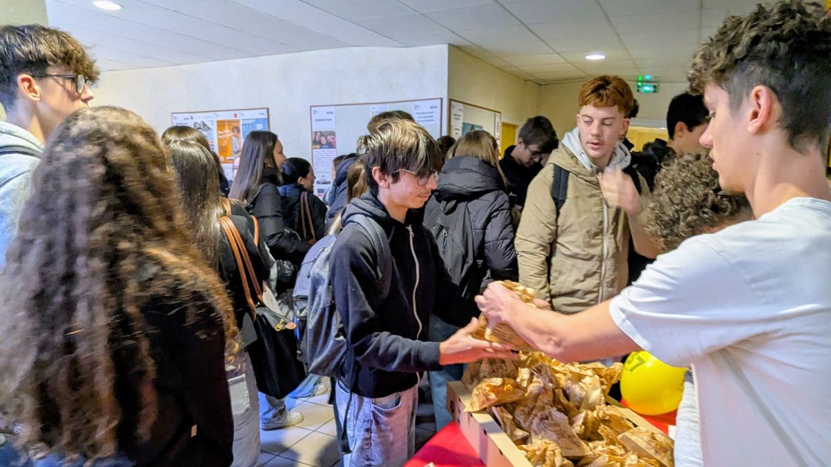 Tout au long de la journée, Cyrielle, Nina, Margot, Mathis et Adam (élèves de la Maison Des Lycéens) ainsi que les adultes référents (Élodie, Fanny et Nathalie) ont vendu des viennoiseries et des boissons aux élèves et aux personnels présents sur les deux sites de l'établissement.