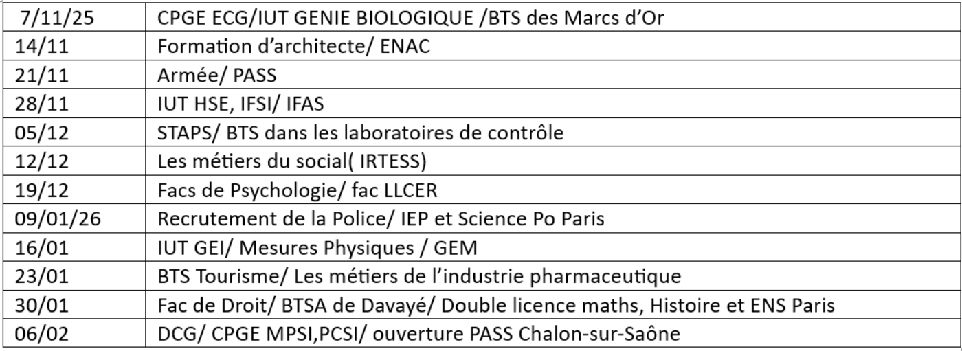 Puis arrivent, début novembre, les vendredis de l’orientation. Chaque vendredi de 12h à 13h de novembre à février, les premières et terminales ont la possibilité de connaître des dizaines de formations grâce à des anciens élèves, des professeurs du supérieur ou des directeurs de formations qui viennent pendant une heure présenter des parcours dans le détail et aider les élèves à trouver leur voie. Cette année encore, ils auront pu assister à 25 nouvelles interventions toutes aussi riches les unes que les autres mais aussi poser des questions, et même prendre rendez-vous pour des journées d’immersion auprès de ces professionnels. Voici un aperçu du programme 2025/2026 :
