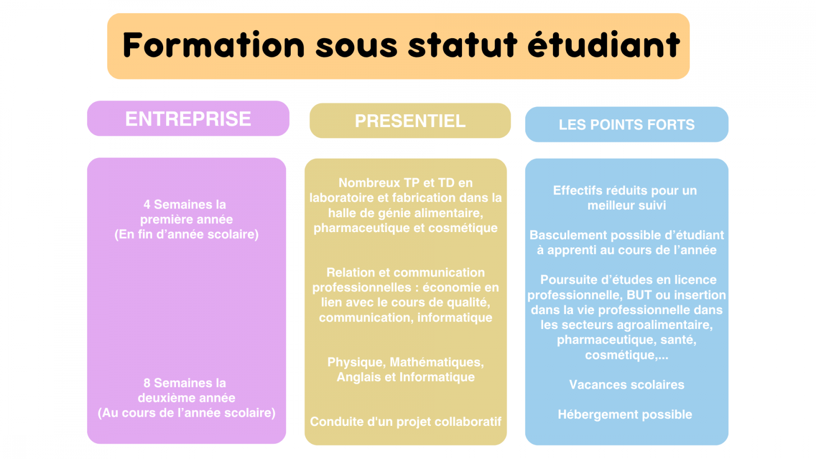 - Pratiques opérationnelles de la qualité : travaux pratiques d’analyses en laboratoire de biochimie, microbiologie…, de fabrication dans la halle de génie alimentaire, pharmaceutique et cosmétique